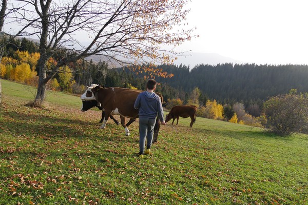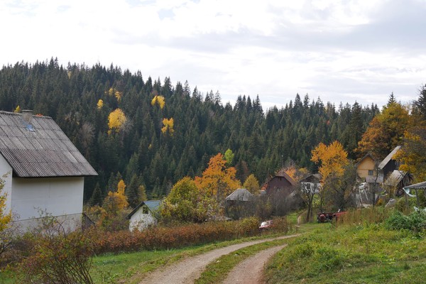 Unter uns entdecke ich ein Dorf und da ich ja von jeher sehr neugierig bin wanderte ich dorthin (allerdings lasse ich Nema, Timo und Lili zuhause da solche Dörfer, wenn sie bewohnt sind ,fast immer Hunde haben und das ist dann eher unentspannt). Ein Schotterweg zweigt ab von der kleinen Strasse und ich erreiche die ersten Häuser die nicht bewohnt scheinen. Der Weg macht eine Kurve und ich höre Hundegebell, sehe Hühner und entscheide mich nicht weiterzugeben um nicht zu stören 😉 Ich bin schon auf dem Rückzug, da ruft es nach mir….eine Frau und ein Junge versuchen mir etwas zu sagen…aber ich verstehe nun wirklich kein montenegrinisch….ich erkläre das ich nur ein wenig wandere und Fotos mache. Mit Pantomime klappt es dann: ich soll bitte aufpassen, der Bulle der bei den fünf Kühen ist sei sehr aggressiv …🐮