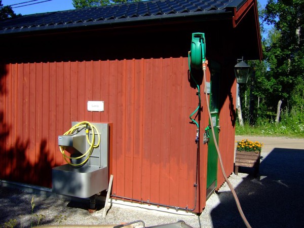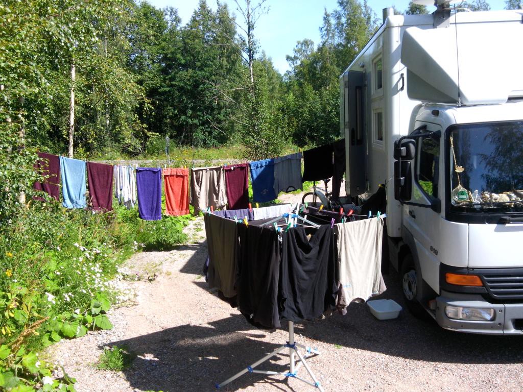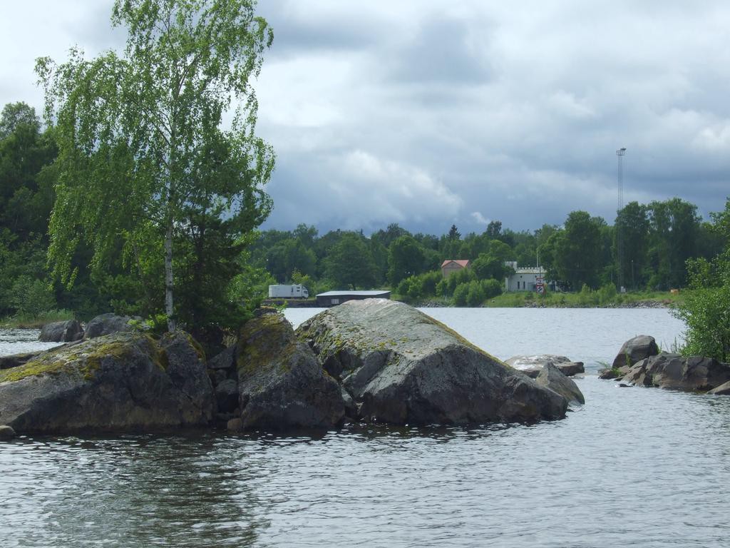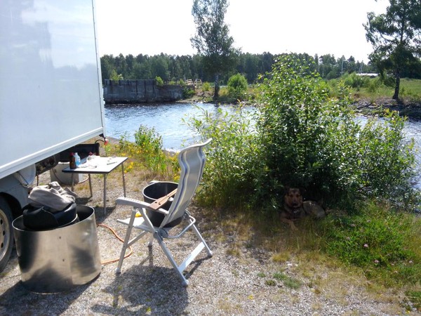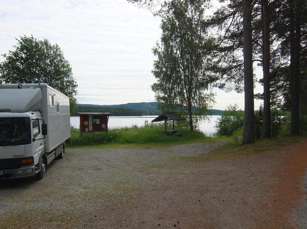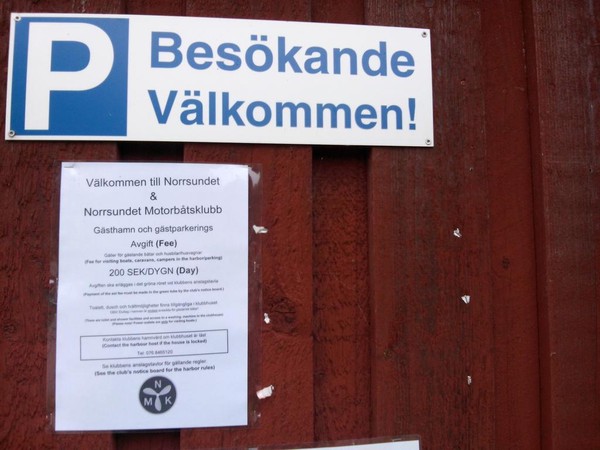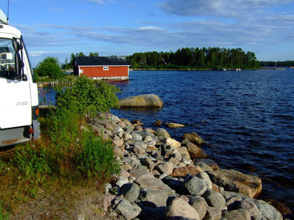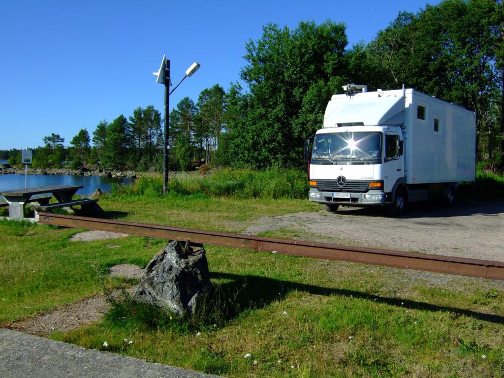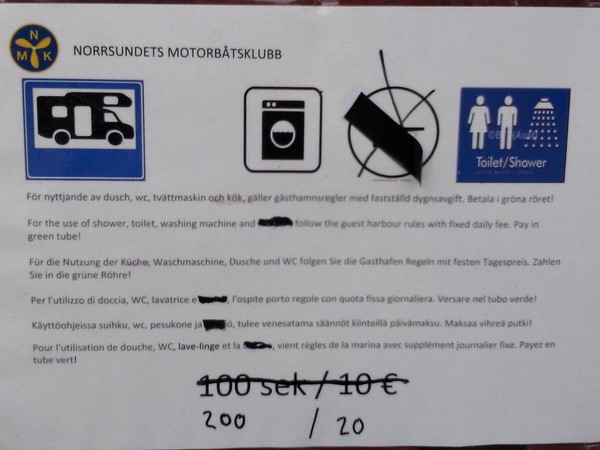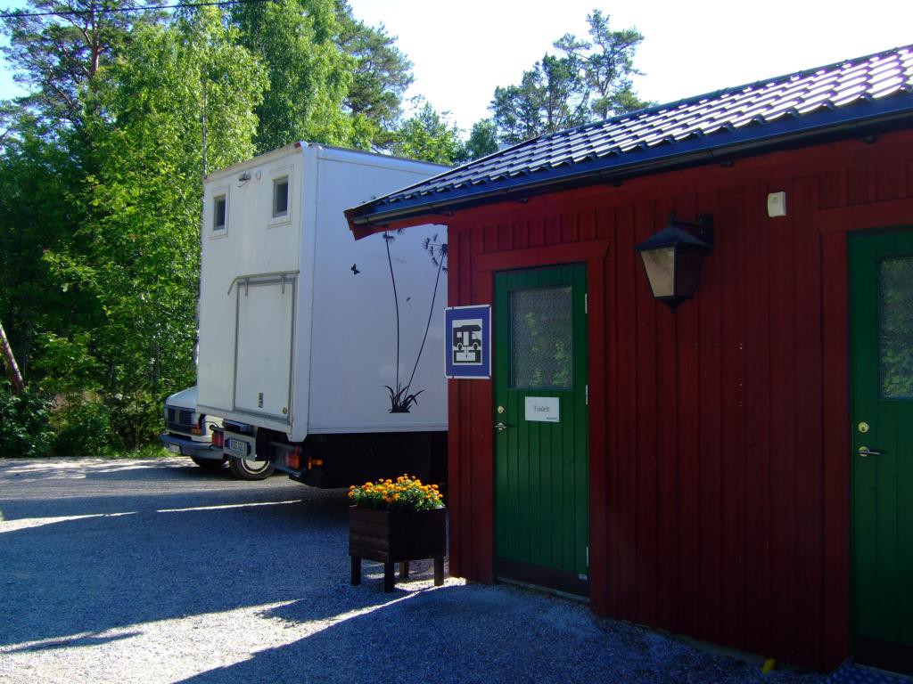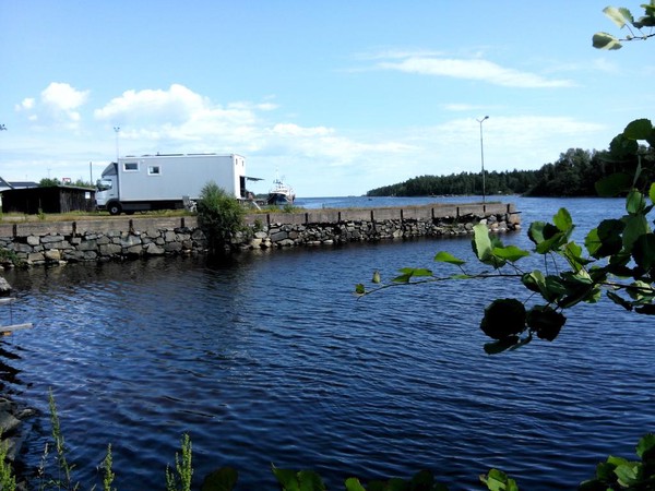 Es gibt einen Wohnmobilstellplatz und unvoreingenommen fahre ich diesen an, bin dann aber ob der Dreistigkeit doch etwas erstaunt. Eine holperige Wiese im Busch am Eingang zu einem per reichlich frequentiertem, staubigen Schotterweg erreichbaren Hafengelände, ist zum Wohnen der motorisierten Besucher vorgesehen. Waschmaschine, Dusche, Toiletten etc. können per Extrazahlung in einem angrenzenden Gebäude genutzt werden. Der Wiesenparkplatz kostete im letzten Jahr 100 SEK oder 10 EUR, jetzt war der Preis etwas korrigiert, 2015 sind 200 SEK oder 20 EUR zu entrichten. Glatte 100% Preiserhöhung. Da fühlt sich der Reisende nicht “Välkommen!”.