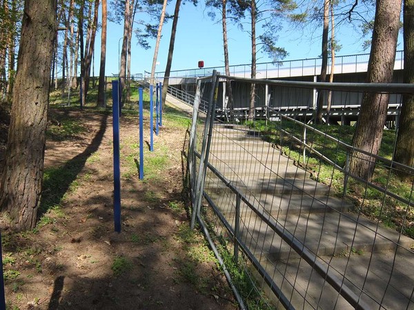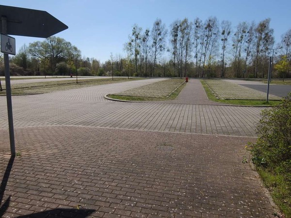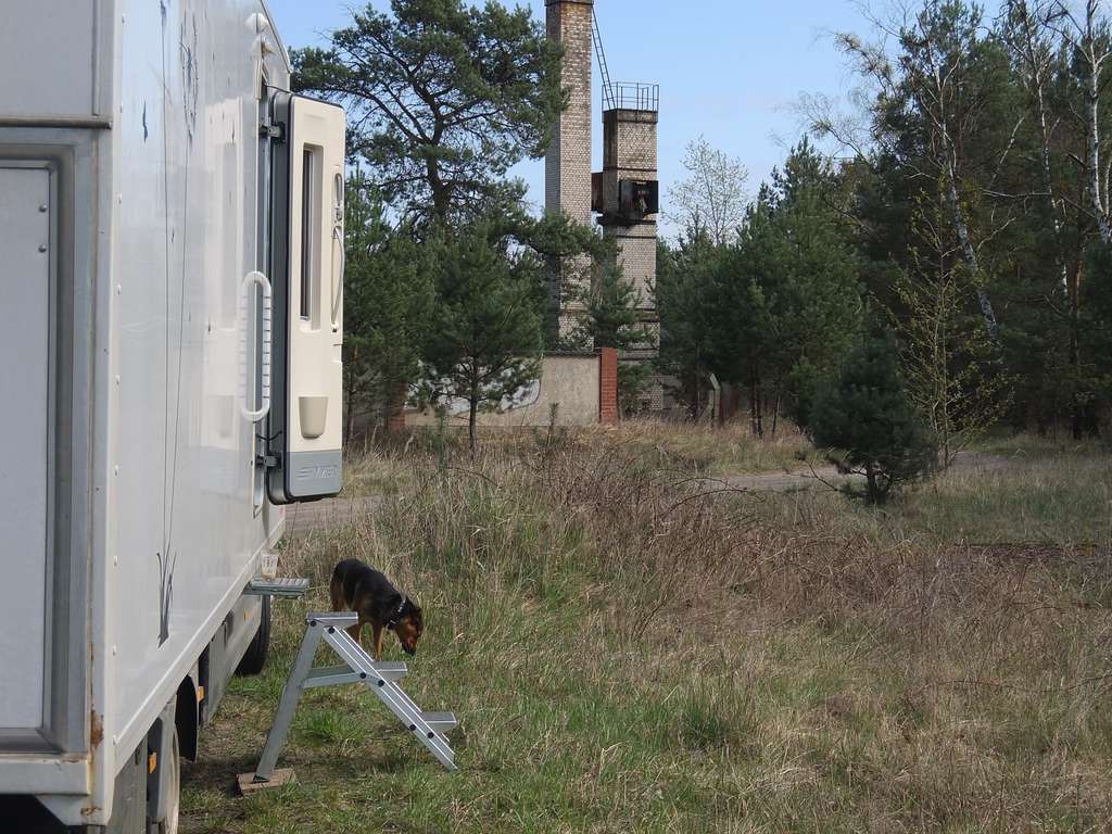 Glücklicherweise hat mein geschultes Stellplatzauge schon wenige Kilometer vorher die Lokalität gescannt und einen geeigneten Ausweichplatz entdeckt. Direkt an einer Ruine eines Heizhauses aus längst vergangenen Zeiten finde ich einen Wohnort und Ruhe im angrenzenden Wald. Ein Hinweisschild zeigt mir den Weg, nur 2,5 km zum Schiffshebewerk Niederfinow. Das ist doch einmal eine schöne kleine Wanderung für einen Montag.