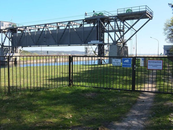 Am Morgen wandere ich den Deich entlang immer Richtung Hebewerk und werde abrupt in meinem Entdeckerdrang gebremst. Der Weg endet vor einem provisorischen Bauzaun, eine neue Aufstiegsanlage für zahlungskräftige Besucher ist in Bau, neue Absperrungen sind bereits betoniert, Grünanlagen angelegt, aber an zu Fuß am Deich entlang kommende Besucher wurde kein Gedanke verschwendet, die können sehen, wo sie weiter kommen.