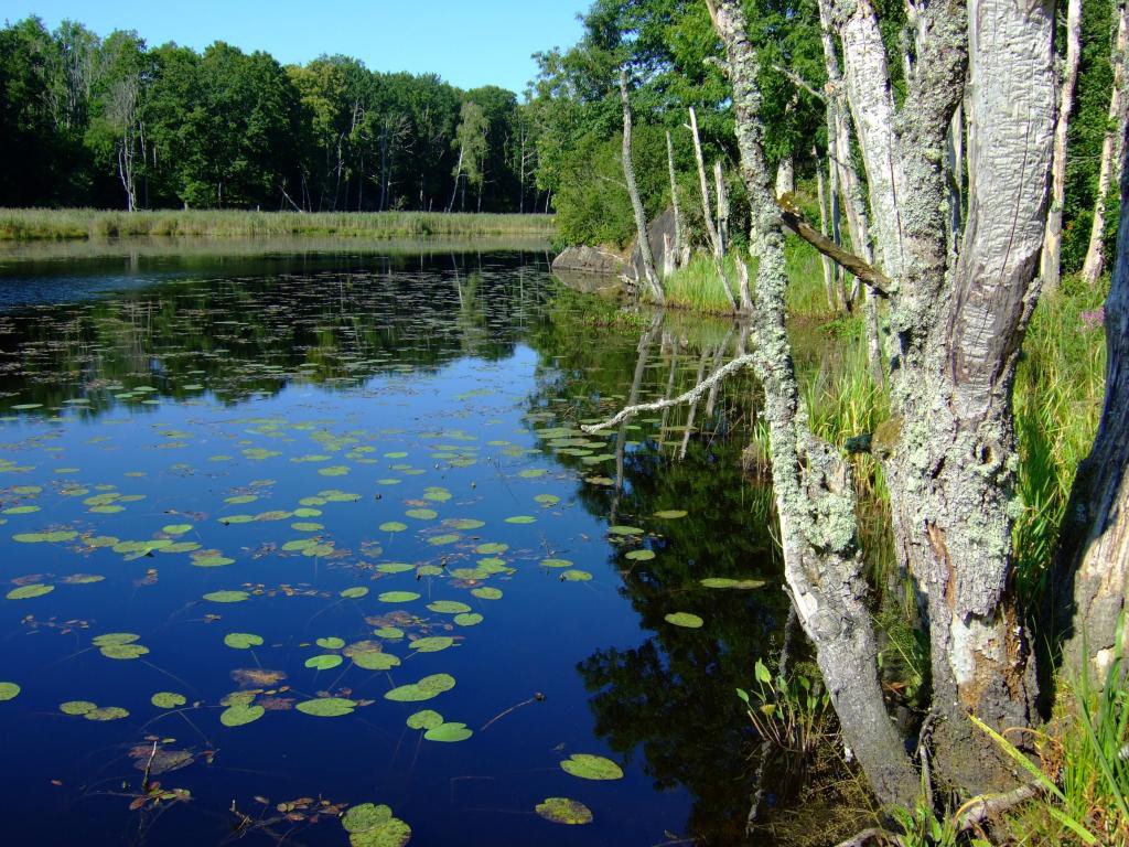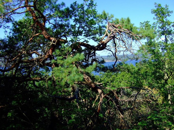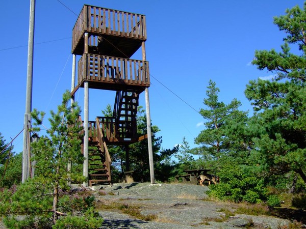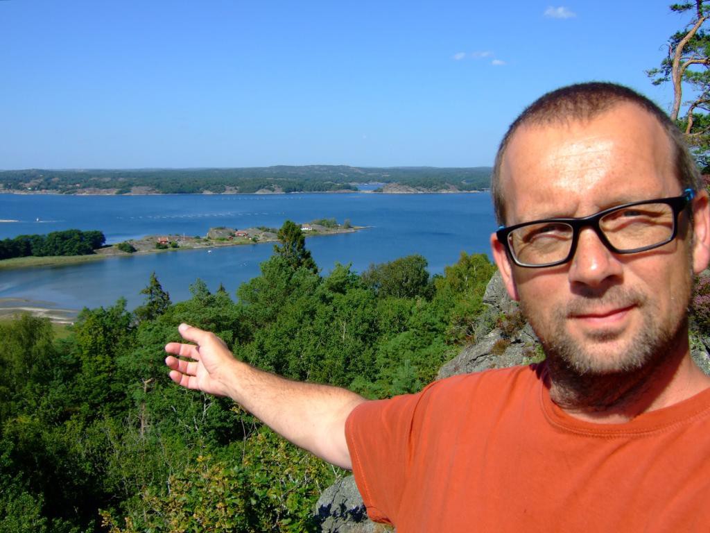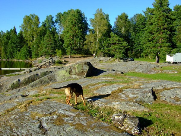 Lange muss ich nicht hoffen. Ein paar Kilometer weiter westlich von Henan beginnt das Naturreservat Morlanda und begrüßt mich mit einem kleinen, leider nicht ganz leisen Waldparkplatz. Einen Rundwanderweg gibt es auch und der ist unerwartet sehr abwechslungsreich. Felsen zum Beklettern, einen etwas wackeligen Aussichtsturm mit herrlichem Blick über die Schärenküste des Bohuslän, Hochwald, eine Seen- und Moorlandschaft, knorrige vom Wind geformte Kiefern, viel Platz und absolute Einsamkeit, Timo freut es und mich natürlich auch. Anscheinend gehört das Wandern nicht zu den Hauptbeschäftigungen der Besucher dieser Urlauberregion. Eine andere Art des Zeitvertreibs der Besucher habe ich schon entdeckt, das Ausführen des eigentlich deutschen liebsten Kindes immer rund um die Insel Orust. Ein Autoverkehr ist hier, als wenn ab morgen das Autofahren verboten wäre. Vielleicht bin ich nach Tagen in der Einsamkeit nur etwas überempfindlich.
