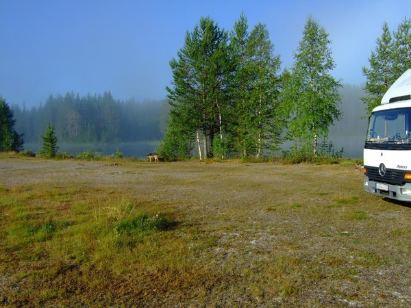 Aber warum ist überhaupt etwas passiert? Nach kurzer Suche entdecke ich das etwa 8x15cm große „Warnschild„: 3,40m Durchfahrtshöhe, oder so ähnlich. So richtig kann ich es nicht glauben, eine Tankstelle mit einem so niedrigen Dach und das in Schweden. Hier dürfen LKW Züge mit 60t Gesamtgewicht (ab 2016 sogar 64t) und einer Höhe von 4,50m fahren. Nicht zu ändern. Das Dach der Tankstelle hat eine kleine Delle davongetragen, eine freundlich lächelnde Mitarbeiterin erscheint und schreibt meine Autonummer auf, obwohl ringsherum so ungefähr 20 Überwachungskameras angebracht sind. Sie meint der Chef habe das angeordnet. Nach eingehender Inspektion hat die Tankstelle im Laufe ihrer langen Lebenszeit schon so einige Blessuren davon getragen. Auch ich dokumentiere alles, mal sehen, ob sie Streit wollen. Zum Weiterfahren ist mir die Lust vergangen und prompt bietet sich direkt am See ein schöner Platz förmlich an.