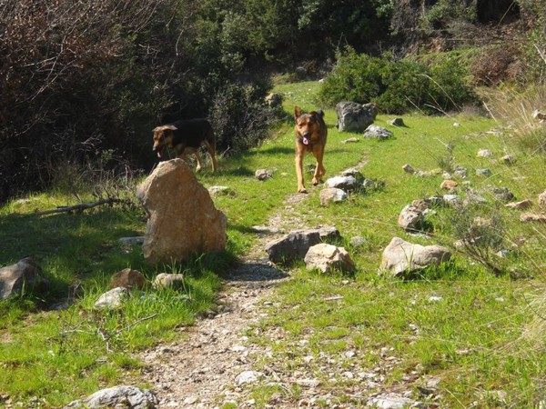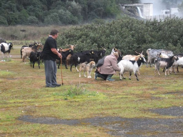 Nach den ersten Kilometern wird die ehemalige Schotterstraße durch eine Straßensperre aus allerlei Paletten, Absperrband und einer Wellblechhütte blockiert. Aus dieser erschien der lokale Ziegenhirte in Begleitung von sechs Hunden und verlangte eine Art Maut, um den Genuss der Naturschönheiten “seines” Wohnsitzes mit mir zu teilen. Die Forderung belief sich auf 2 Euro (ohne Beleg), die ich erst einmal mangels der zwei Euro ablehnen musste. Nun, man könne auch in Naturalien zahlen, da der Hunger sowieso kurzfristig nicht mit Geld zu besiegen sei. Prompt förderte ich eine Banane aus den Tiefen meines Rucksacks, ein Lächeln meines Gegenüber und ein σας ευχαριστώ ließen mich unbeschwert meinen Weg fortsetzen.