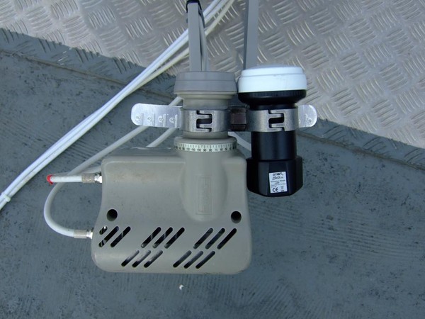 Jetzt habe ich mich für eine relativ stabile Antenne aus dem Hause Fuba entschieden, ähnlich wie es Andre von Amumot in seinem Blog beschrieben hat. Die Last an der Multi LNB Schiene ist schon gewaltig, allein das Internet LNB wiegt 1,1 kg. Montiert ist die ganze Konstruktion am Heck mit zwei Deichselstützradklemmen aus dem Anhängerbau, verschraubt an zwei Wandabstandshaltern für Mastrohre. Zum Fahren wird einfach der Antennen Spiegel abgenommen und der Mast mit Haltearm abgesenkt und zur Heckwand gedreht.
