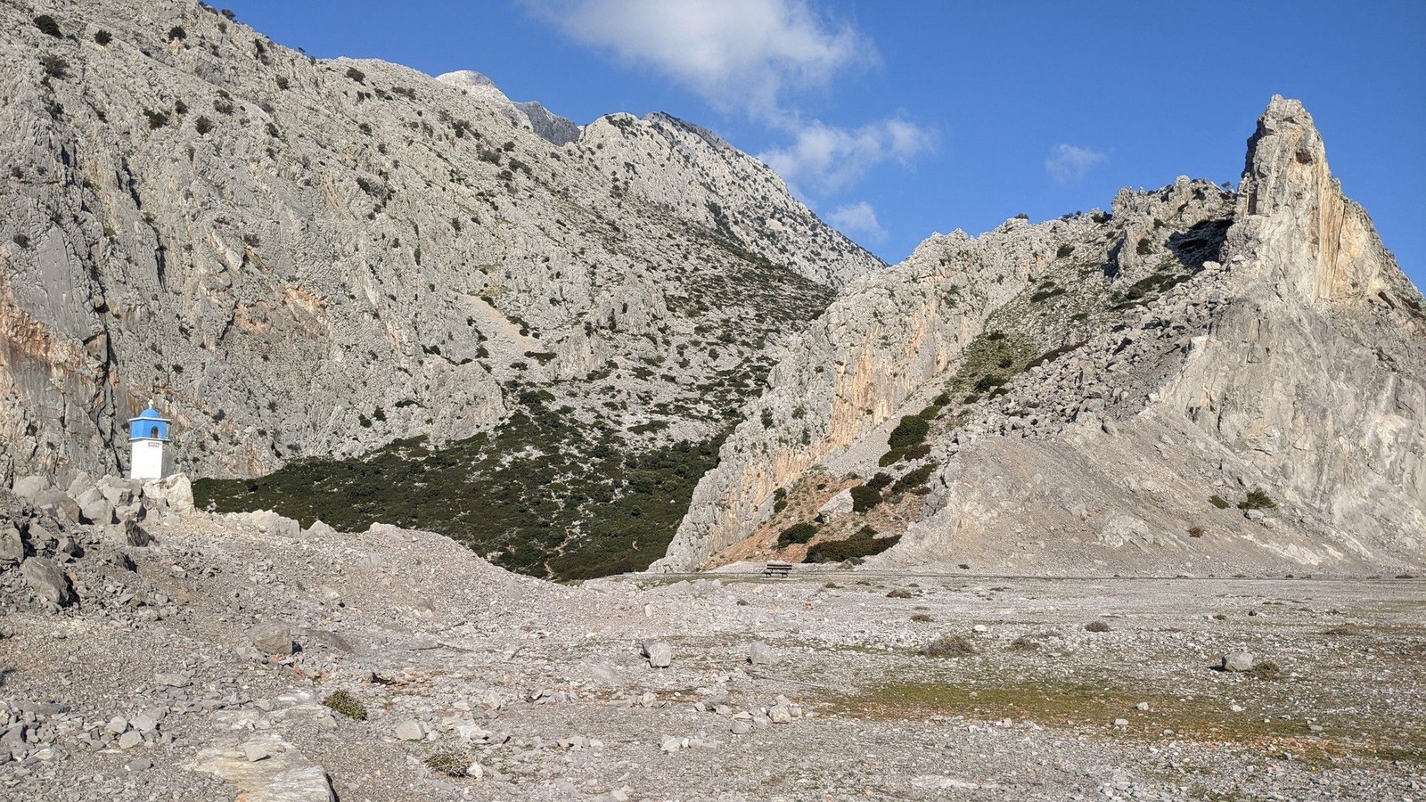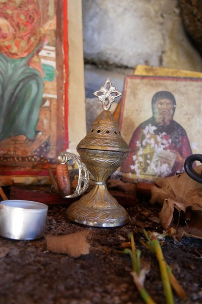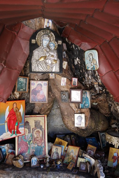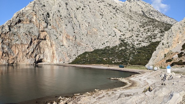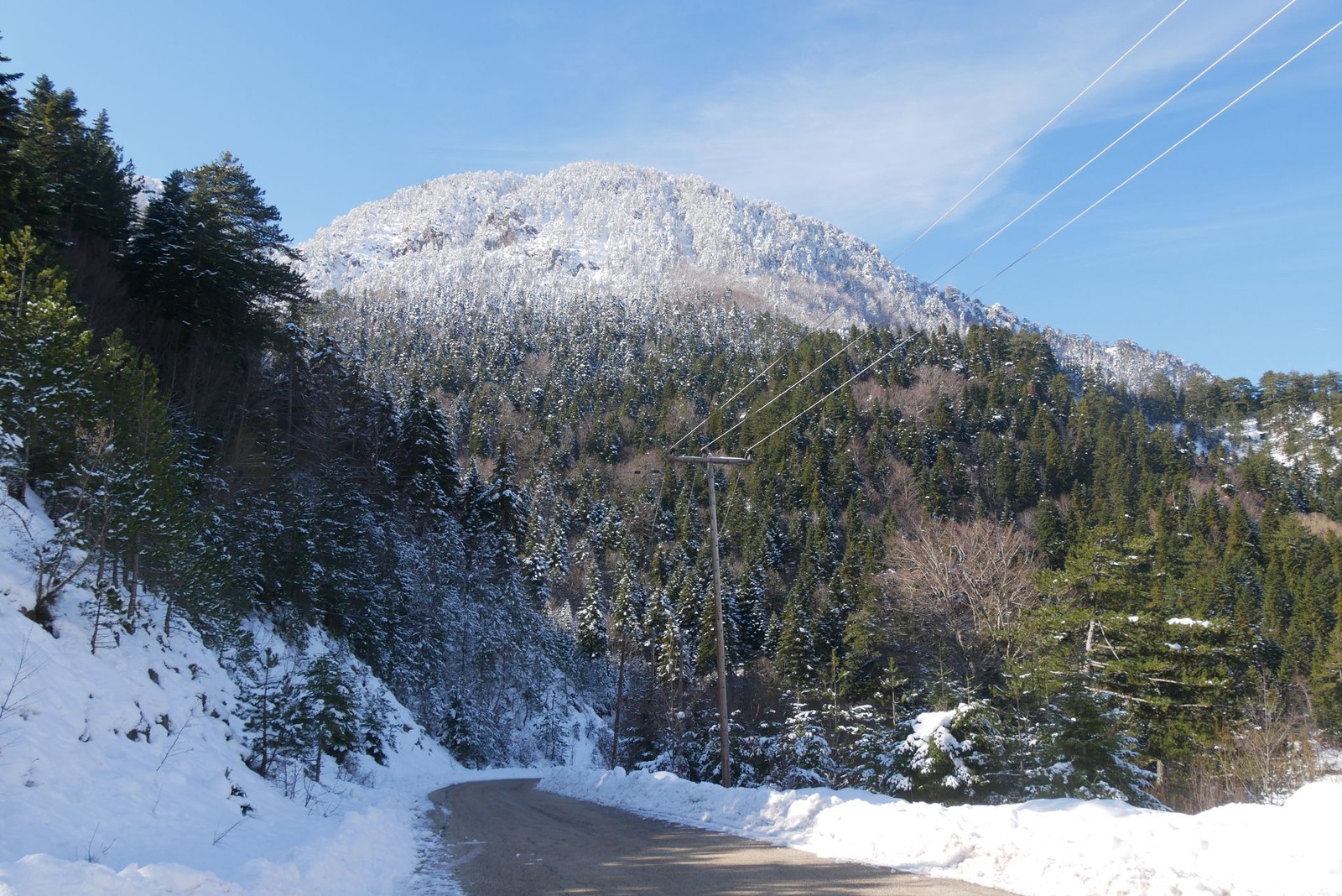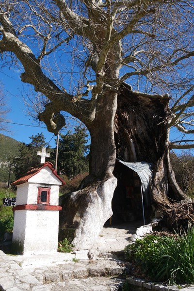 Der erste Eindruck : alle paar Meter steht ein kleiner, kunstvoll gebauter Schrein am Straßenrand mit brennenden Öllampen und Ikonenbildern im kleinen Inneren. Der Grieche fährt auf dem Land meist uralte Pickups und fast immer fährt er noch langsamer als wir, das passiert uns sonst eher nicht so oft. Kleine Dörfer haben mindestens ein meist voll besetztes Café, eher drei, und kleine Supermärkte gibt es auch überall. Die Sprache ist, wie auch albanisch, schwer zu verstehen und auf Straßenschildern mal so gar nicht zu lesen, wenn man kein kyrillisch entziffern kann. Im Kreisverkehr gibt es die unterschiedlichsten Vorfahrtsregeln, also immer gut aufpassen. Die Griechen können, im Gegensatz zum Balkan, fast alle ziemlich gut englisch, da die Filme hier im Fernsehen nicht synchronisiert werden. Die Straßen sind wieder schlechter, das Fahren auf ihnen erinnert eher an eine Bootstour mit vielen plötzlichen Wellentälern. Die Griechen sind freundlich und das Land ist voller Oliven-, Maronen-, Zitronen-, Orangen-, Mandel-, Feigen-, Walnuss- und Erdbeerbäumen. Und es gibt einfach überall Berge zu sehen, im Moment sogar mit Schneemützen, für uns genau das richtige.