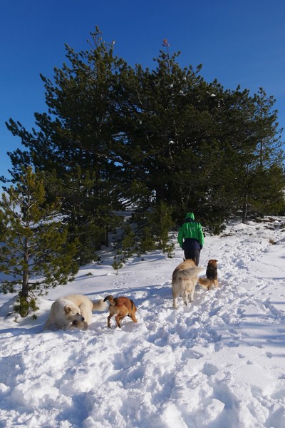Wir fahren zu einem wundervoll türkisfarbenen Fluss, dem Voidomates, an dem uralte Platanen stehen und ein verzaubernder Wanderweg tief in die einsame Schlucht führt, am Wochenende nur frequentiert von etlichen Raftingbooten Und da es ja nicht sein kann, das wir einen kompletten Winter so ganz ohne mitten im Schnee zu sein verbringen, besuche ich vom schönen Örtchen Konitsa aus Freunde oben in den Bergen bei Pades, wo auf 1300 Metern dann endlich die Füße tief im Schnee versinken bei einer traumhaften Wanderung. Ein Abend am Kamin mit vielen Geschichten, immerhin haben wir uns das letzte Mal vor fünf Jahren in Spanien getroffen. Aber so ist das mit uns Reisenden, nicht der Zeitraum ist entscheidend in dem man sich sieht oder eben nicht sieht, sondern die Verbundenheit miteinander. Kurz überlegen wir unsere Route durch Griechenland spontan zu ändern und die Bergwelt hinter Pades auf kleinsten Bergstraßen zu erkunden, aber ein Blick auf die Wettervorhersage lässt uns davon Abstand nehmen, ist doch weiterer Schnee und Kälte angekündigt. Eine weise Entscheidung wie sich ein paar Tage später zeigt, denn Pades versinkt im Schnee und die kleine Bergstraße ist fast kniehoch verschwunden.